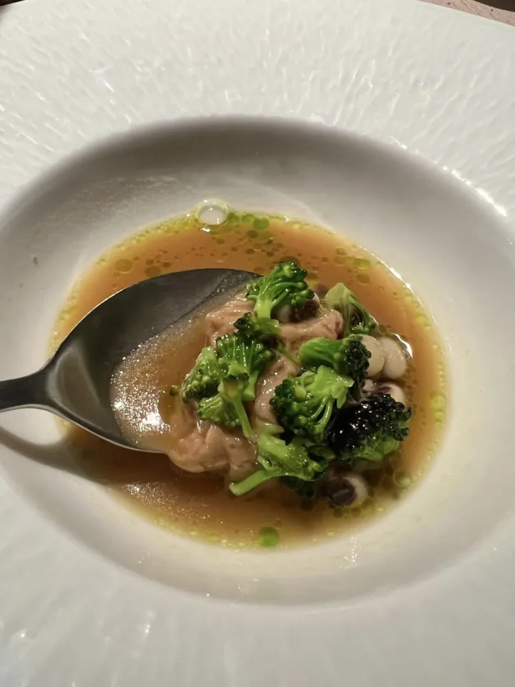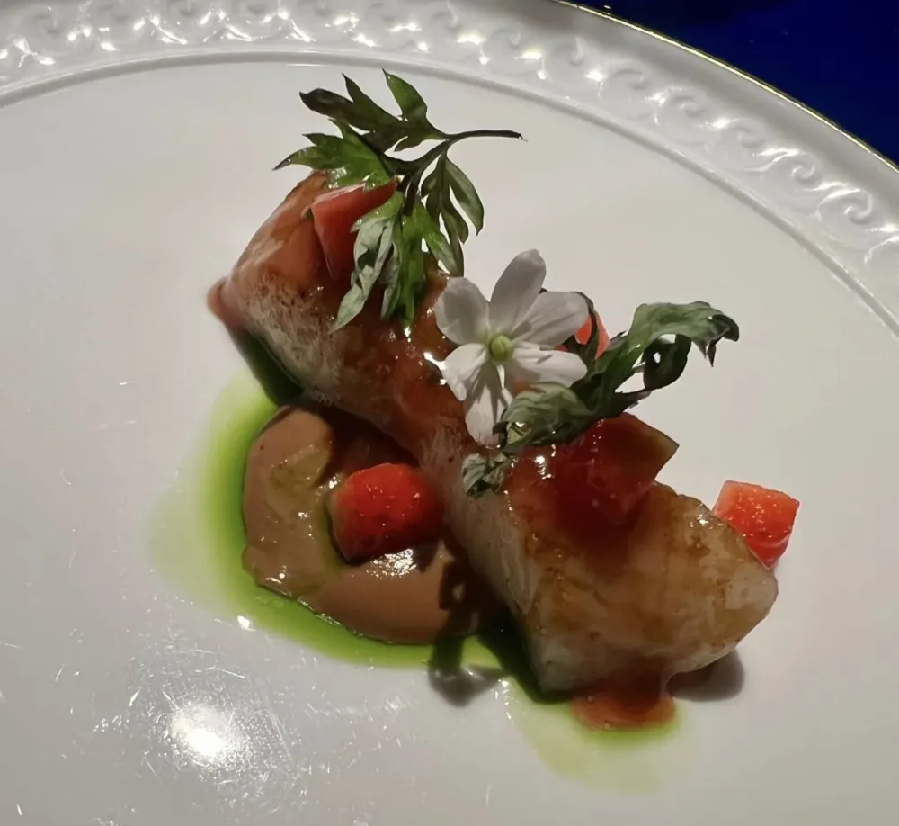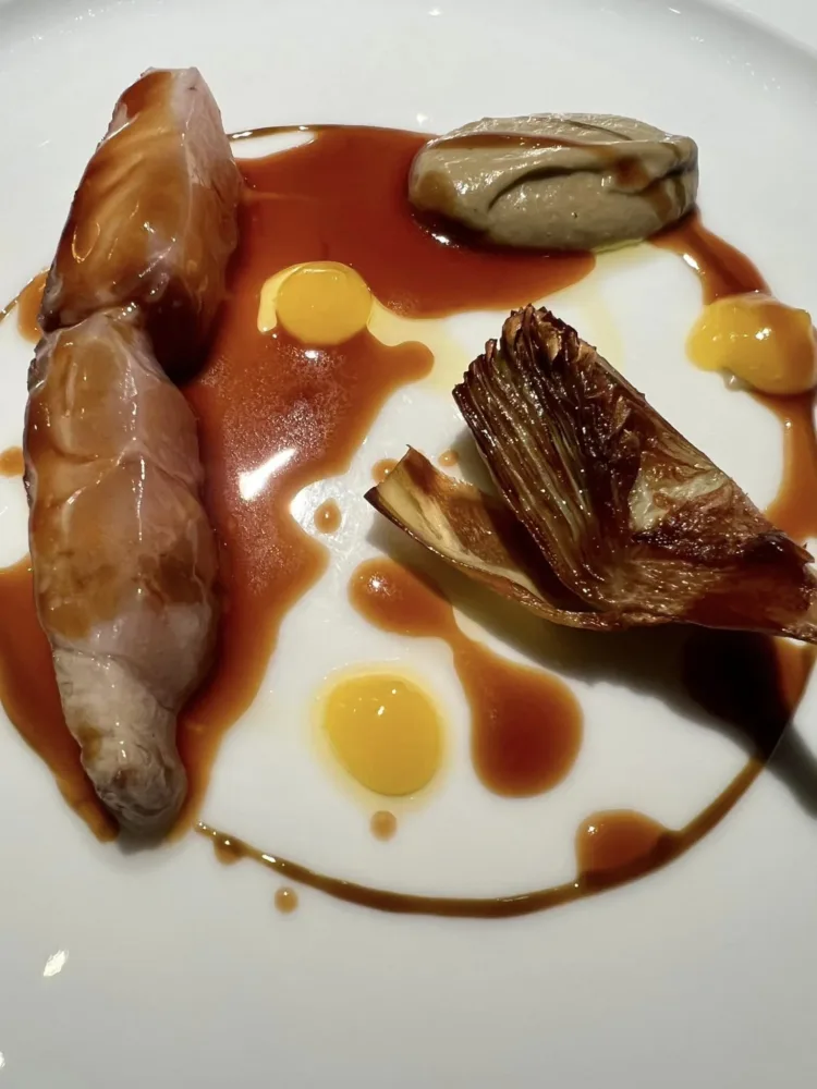 Un piatto ghiotto, giocato sulle diverse consistente, talvolta si punta omeopaticamente sulla dolcezza, altre si lavora per contrasto. Una materia prima assolutamente sotto controllo, di quei colpi lanciati a memoria