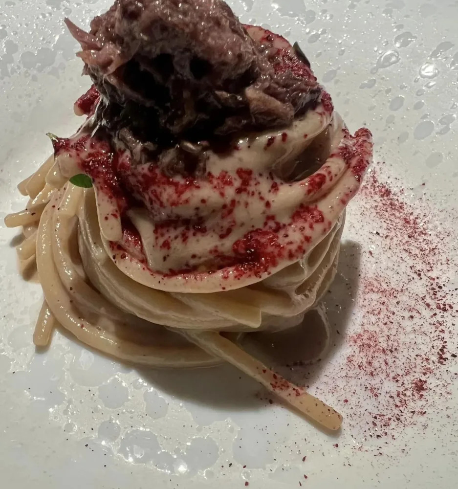 Ma, poiché la vita continua, procediamo con alcune estrapolazioni dal menu vegetale: un’estetica rosa di rapa, kefir di capra, liquirizia e arachidi e le Casarecce integrali “Fracasso” (piccolo pastificio locale) con Fagioli di Lamon e Olio “Le Marsicane” di intrigante persistenza, prima di pescare a piene mani nella parte più selvatica e intensa del menu di terra.