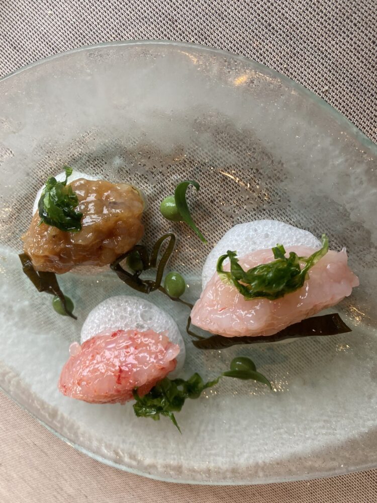 La Peca – gelo di acqua tonica, lime profumo di gin con tartare di scampi, gamberi rossi e canoce.