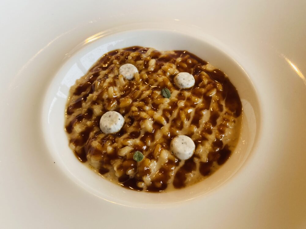 Un trittico sensazionale, da manuale della cucina. Risotto di faraona, porro e mosto d’uva Garganega; Sella di lepre dry-age, nespole al bitter, scorzonera e amaranto; e Germano reale alle verze tostate, coscia fondente e crostone ai fegatelli.