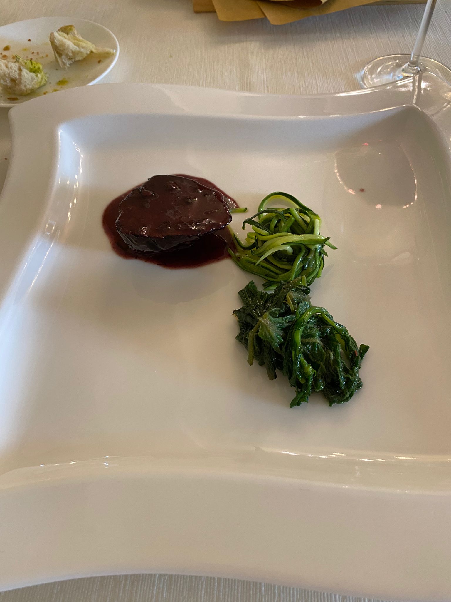 Unica concessione alla carne è il Campanello al Taurasi, un pezzo di secondo taglio che richiede una sapiente e lunga cottura, lo stesso che a casa sua si è sempre usato per il ragù, accompagnato da borragine saltata in padella e nastri di zucchine dell’orto.