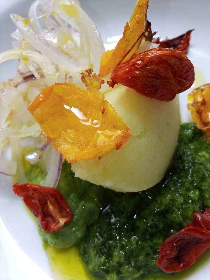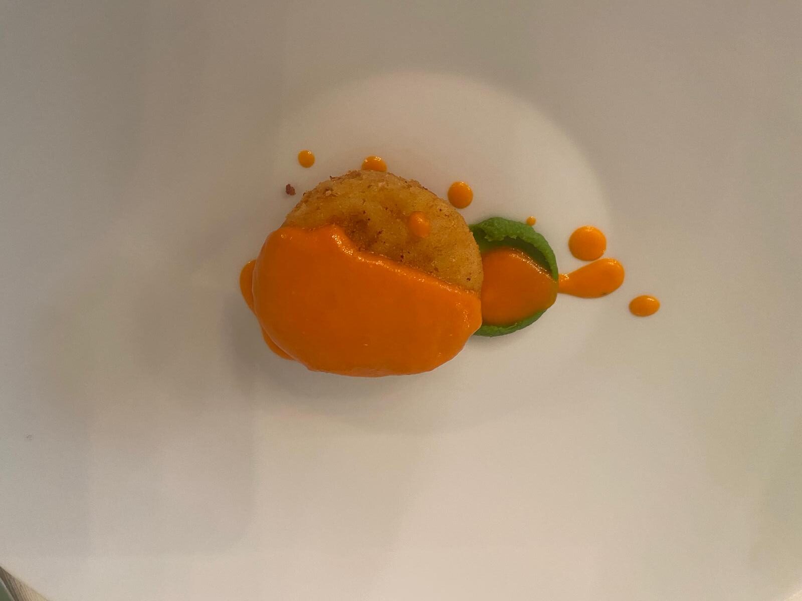 Per iniziare ci viene servita una frittatina di pasta, senza fantasiose (e di dubbio gusto) cremine che ne stravolgono il gusto (unica concessione un cucchiaio di sugo di pomodorino giallo) accompagnata da Le Preziose, polpette di pane raffermo, caciocavallo podolico ed impreziosite, appunto, da una generosa grattugiata di profumatissimo tartufo estivo, “ma sono buone anche senza come le faceva nonna”, precisa la chef.