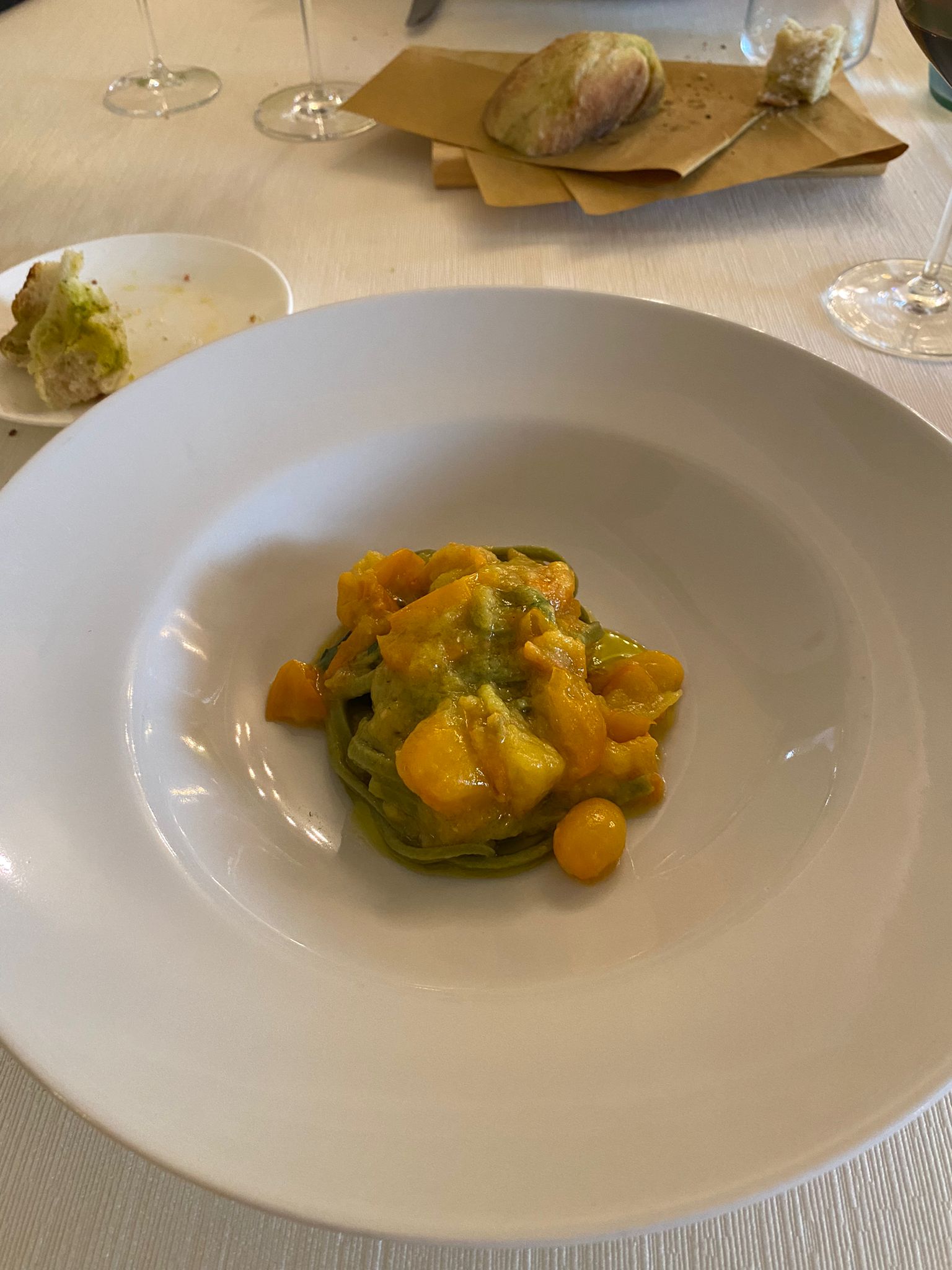 Il primo, le fettuccine alle ortiche con pomodorino giallo, parlano dei boschi irpini e di quelle erbe spontanee preziose tanto quanto quelle dell’orto: un piatto di rara semplicità e freschezza.