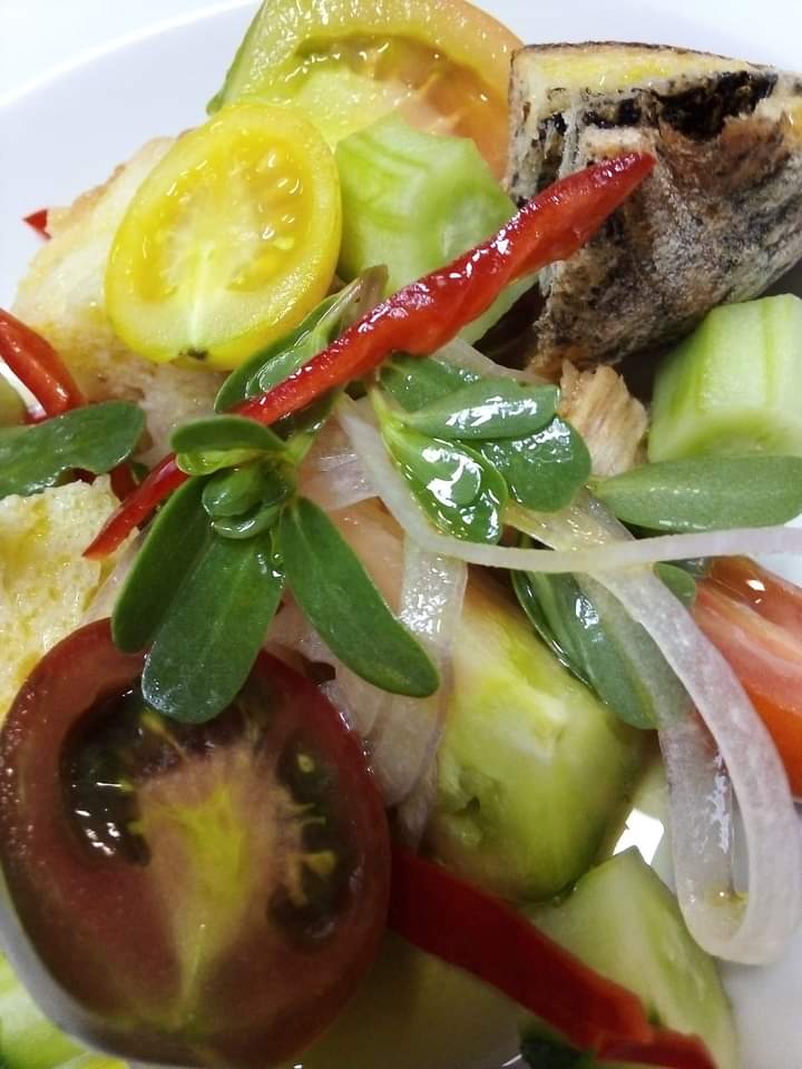 A seguire il Baccalà come un pomodoro: pomodoro ripieno di baccalà e pane raffermo, deliziosamente decorato tanto da sembrare un quadro naif. Il tema del riciclo torna quasi in ogni piatto.