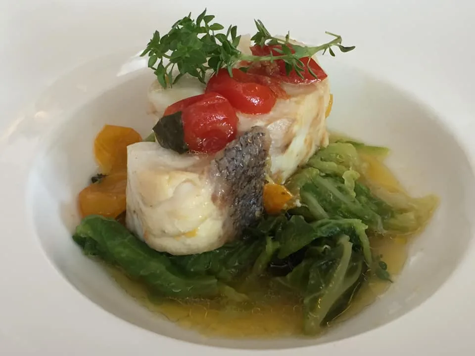 Il comparto più grande della sua dispensa è sicuramente il mare, raramente assoluto ma sempre accompagnato dai prodotti dell’orto, compresa la frutta. Le origini collinari si sentono tutte.