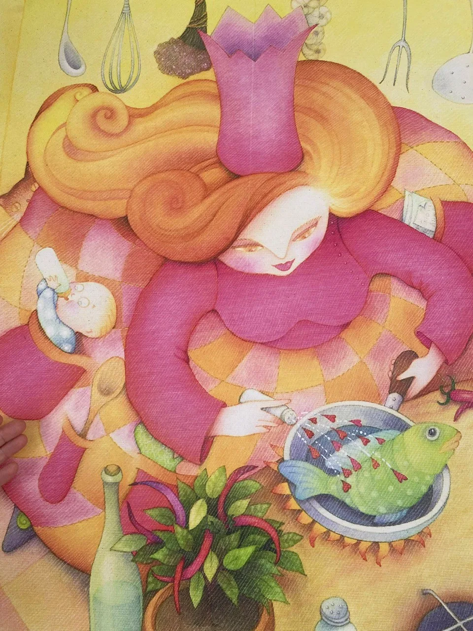 Prima ancora di entrare nel locale, gli occhi sono catturati da due stampe naif, uguali ma posizionate una all’esterno e l’altra in sala, dai colori vivaci che rappresentano una donna mentre cucina, e dalla saliera escono cuori, con un bambino avvolto nella gonna che sta prendendo il latte dal biberon: è il manifesto della cucina di Maria Rina, tanto quanto la piramide alimentare in legno, costruita da lei per spiegare ai più giovani uno stile di vita sano, posizionata accanto al quadro.