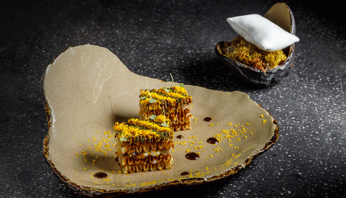 L’idea di questo piatto nasce dal formato e dalla consistenza della pasta scelta, utilizzata per l’occasione in maniera insolita. Le note acide e amaricanti completano e bilanciano la preparazione. Nella presentazione è stata inserita una piccola parte in tessuto, servita a parte, su cui viene nebulizzata l’essenza di sottobosco.