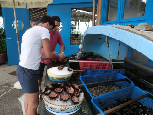 Ci si affida, dunque a quel che c’è: verdure, latticini, frutti di mare e ricci messi nel piatto al volo. Si chiacchiera, si beve un vino, magari anche delle percoche in un bianco a caraffa. Perché no? Ci si rilassa. Si entra in empatia con il ritmo naturale, il cammino del sole, il mare, la macchia mediterranea, il casino nella spiaggia, le barche che vanno e che vengono.