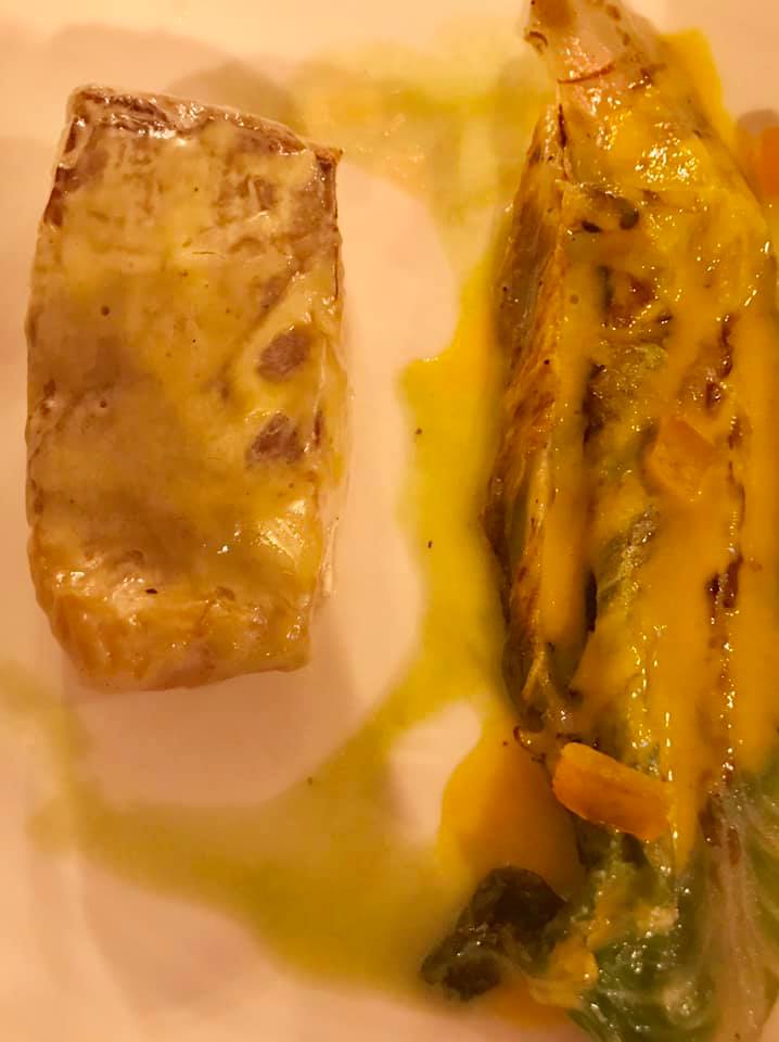 Tra tutti, un piatto davvero clamoroso è il mezzo rigatone con zafferano, arancia e cicoria, a riprova che in quest’anno 2025 i bravi e i bravissimi chef si stanno cimentando in piatti di pasta secca di altissimo profilo. In questo piatto si respira un sapore ancestrale, una storia che attraversa il passaggio arabo e l’isolanità che fu. Davvero eccezionale.