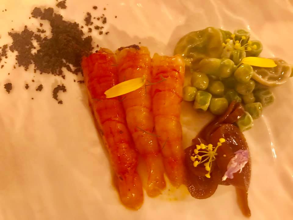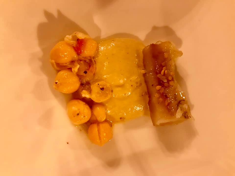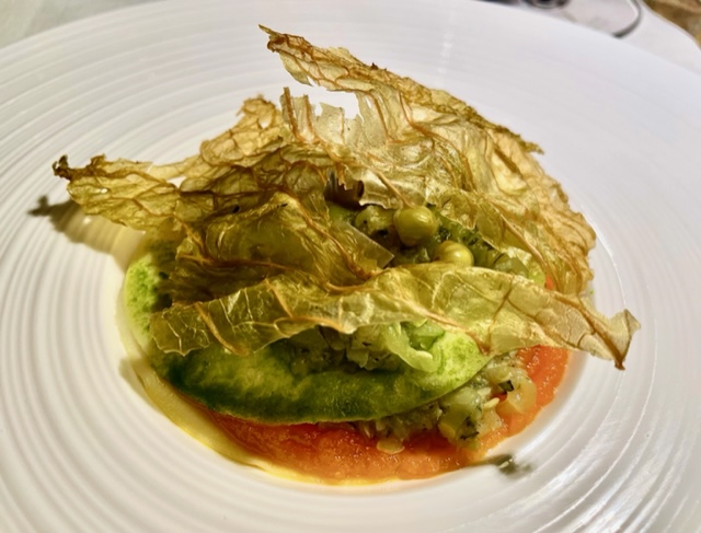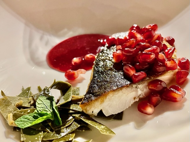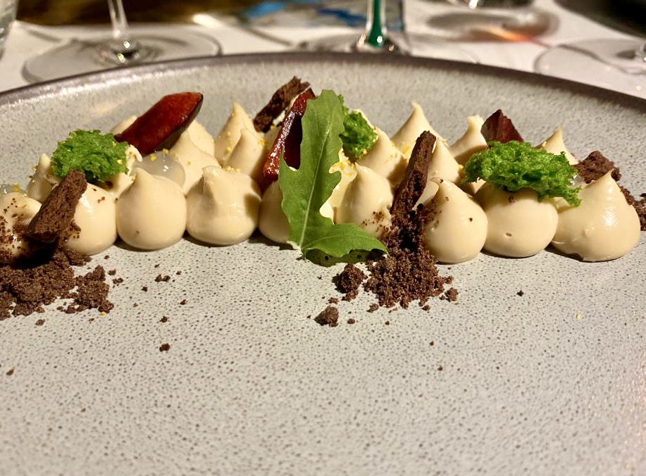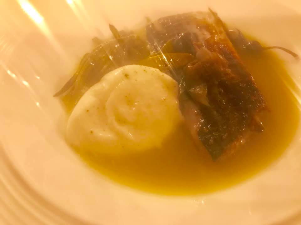 Proseguiamo con lo “Sgombro affumicato, melograno, foglie di capperi e menta”, che è un inno al Mediterraneo, perfettamente bilanciato per intensità e freschezza.