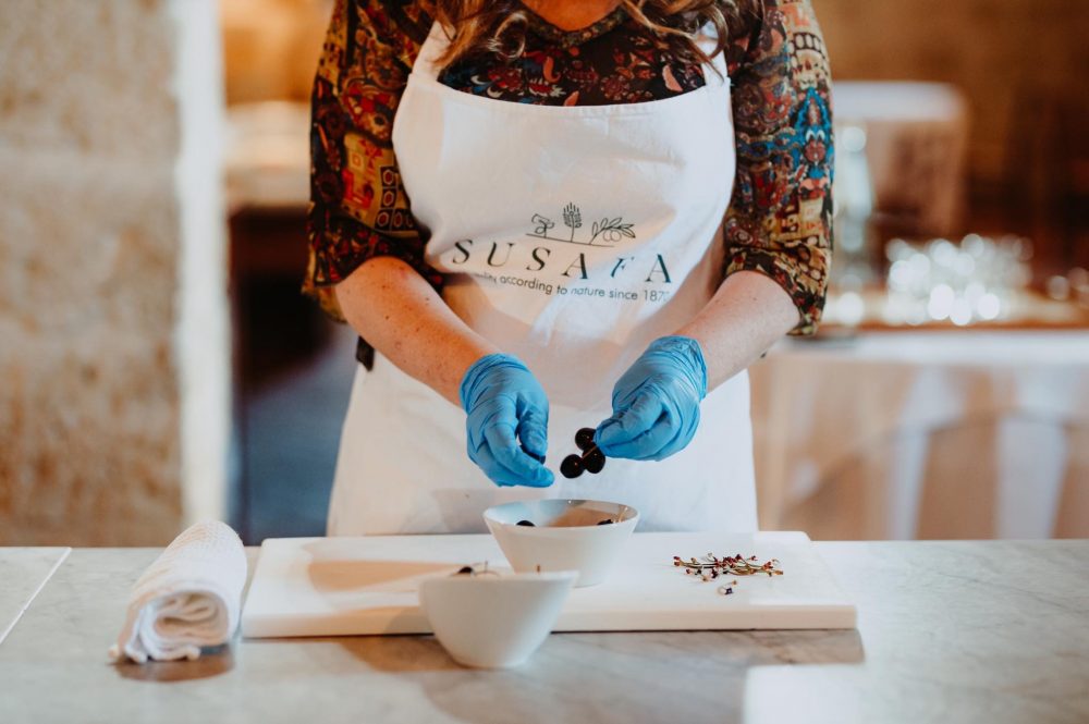 Qui la cucina predilige l’uso degli ortaggi dell’orto, fiore all’occhiello della masseria, delle profumate erbe aromatiche, dei frutti del rigoglioso giardino e delle carni locali. Susafa mantiene stretto il suo legame con la terra: non ha perso la sua anima agricola ma anzi punta su di essa per il futuro.