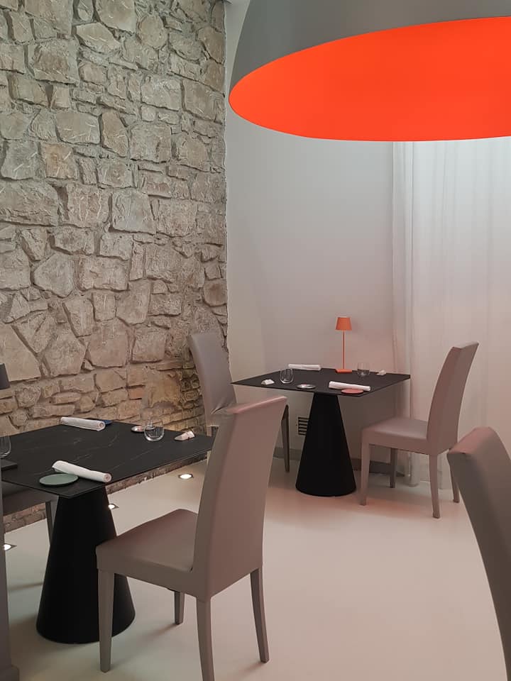 Del suo radicamento alla terra natia, ci si accorge già entrando nel locale, dove campeggiano i quadri di Peppe Oklyt, unica nota colorata in mezzo a linee pulite e monocromatiche, che non distraggono il cliente dal tavolo e dalle portate.