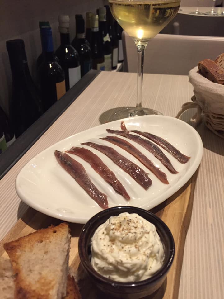 Il locale è sobrio, luminoso, di un’eleganza quasi severa, e si affaccia sulla strada con grandi vetrate; i colori catturano le diverse tonalità del mare, e i tavoli – una quarantina di coperti in tutto, ma d’estate ci si siede anche fuori – si affiancano alle centinaia di bottiglie esposte sugli scaffali bianchi.