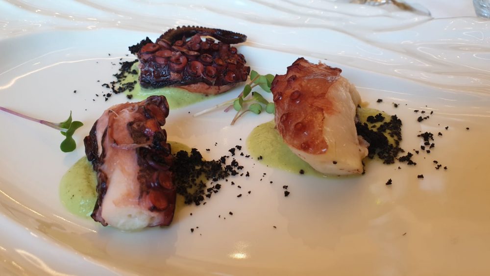 Crema di zucchine a scapece con tentacoli di polpo e terra di olive. Qui l’influenza campana dello chef si ritrova tutta nelle zucchine che hanno il sapore di un tramonto partenopeo con il Vesuvio sullo sfondo.