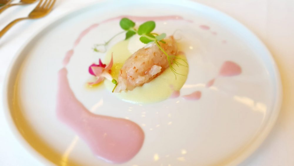 ME Restaurant – Quenelle di gamberi viola, centrifuga di cetrioli e panna acida al bergamotto ed emulsione di cipolla rossa di Tropea