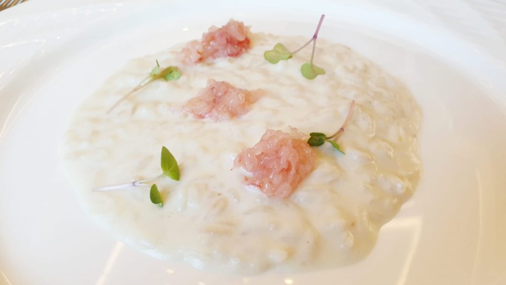 ME Restaurant – Riso carnaroli di Sibari mantecato con burro acido e arricchito con tartare di gamberi e ricotta di bufala