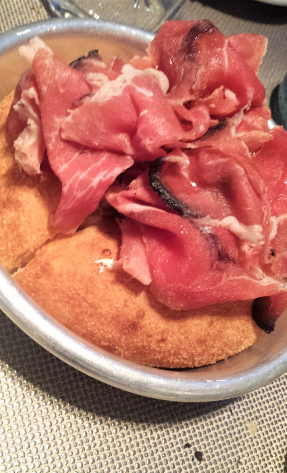 Ma il momento più smoothy coincide con l’arrivo in tavola delle focacce, che già di per sé richiamano un angolo caldo in cui accoccolarsi, ma che in questo caso sottolineano anche una precisa e coerente scelta semantica: nulla a che fare con la pizza, focaccia è e focaccia sia. Straordinaria, peraltro: una nuvola di fragranza che si pone, per estetica, lievitazione e riferimento qualitativo tra i lievitati di Simone Padoan e l’aria di pane di Renato Bosco (chiederò invano, ma scoprirò poi che Simone Lombardi, l’artefice di pizze e focacce, è passato dai Tigli di San Bonifacio). Normale che tale bontà sia perfetto supporto per salumi e formaggi di qualità, secondo estro e controllata fantasia: quella con Yogurt salato e vinappeso, l’insaccato cugino del culatello lasciato affinare nell’amarone, è abbastanza, ma solo abbastanza, commovente – ebbene sì, m’è scappato – anche e soprattutto per le note speziate del vermouth nel mio Negroni, che all’unisono hanno preso a zompettare di gioia.