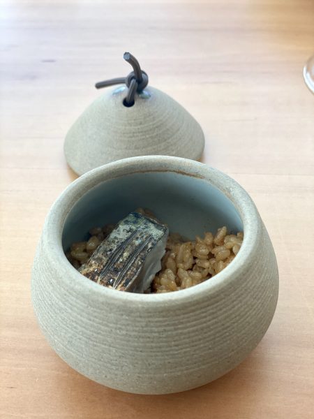Non manca il riso giapponese, il Ghoan, cotto con dashi, salsa soya, mirin, sake e zenzero tritato, servito con bottarga di spigola e sgombro marinato in aceto di riso, sale e zucchero di canna.