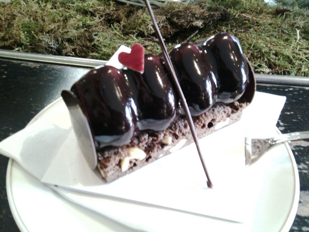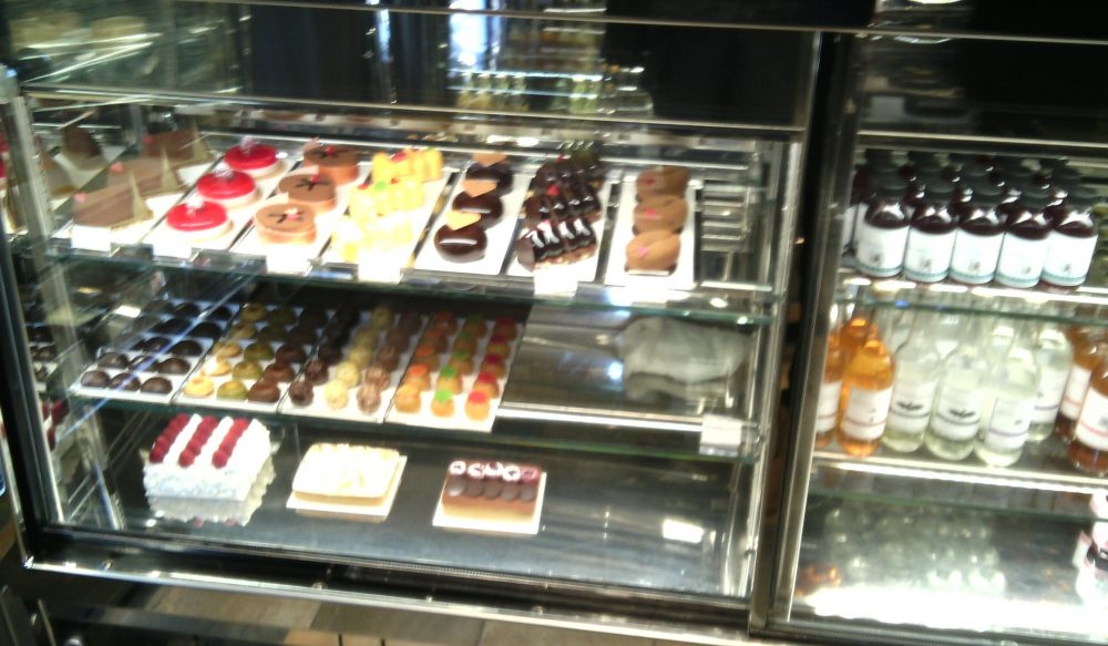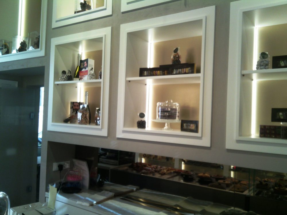 Uno spazio polifunzionale nel quale il concetto di negozio e caffetteria perdono il loro senso convenzionale. Ogni stanza, ogni anfratto interno nascondono qualche sorpresa; si avrà in questo modo in uno stanzino la parte dedicata alle torte moderne e alle monoporzioni, poco oltre il piccolo spazio caffetteria. Al centro un alto tavolo di legno nero sopra al quale emergono da un rado prato campane, come verdi virgulti, che coprono biscotti, sacchetti pre confezionati, dolci da colazioni, singoli cioccolatini. Ben oltre il tavolo, gli ospti sono circondati da scaffali, stipiti, colonnine con dolci in esposizione da mangiare subito o da portar via, ricreando un poco quella sensazione che sia avverte quando si legge ancora bambini la fiaba di Hansel e Gretel. Per i più curiosi, vicino alla piramidale vetrina di cioccolatini, c’è un banco direttamente affacciato sulle laborioso cucine del ristorante.