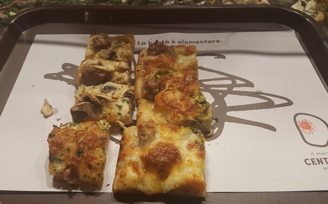 Bonci, pizza mozzarella, funghi e salsiccia e pizza mozzarella, broccoli, salsiccia e paprika