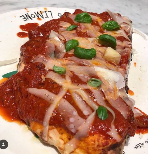 Idratazione dell’impasto curata al massimo, ingredienti altamente selezionati e una pizza a canotto ormai diventata famosissima: Carlo Sammarco per il nuovo menu ha lavorato con attenzione su prodotti d’eccellenza, abbinamenti della tradizione popolare e contrasti cromatici, proponendo due pizze veramente interessanti. La prima è “Donna Pina”: crema di ceci di Cicerale bio (presidio Slow Food), guanciale croccante di Gioi, scorzette di parmigiano reggiano stagionato 36 mesi del Consorzio Vacche Rosse, fior di latte dei Monti Lattari, basilico fresco e olio evo.