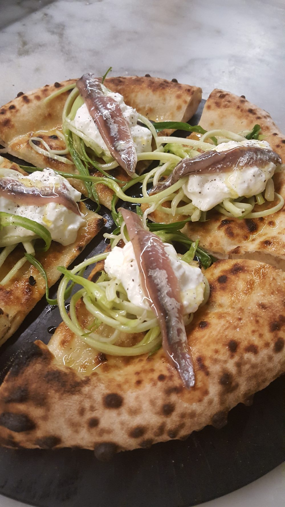 Pizzeria Sancho, pizza con baccala’ mantecato, carciofi fritti e mentuccia