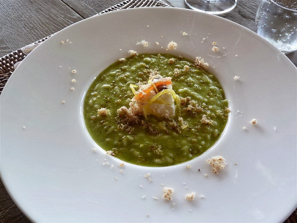 Colletto Agribiorelais, Adrara San Martino. In uno splendido contesto risotto con lattuga, burrata, limone candito e sarde