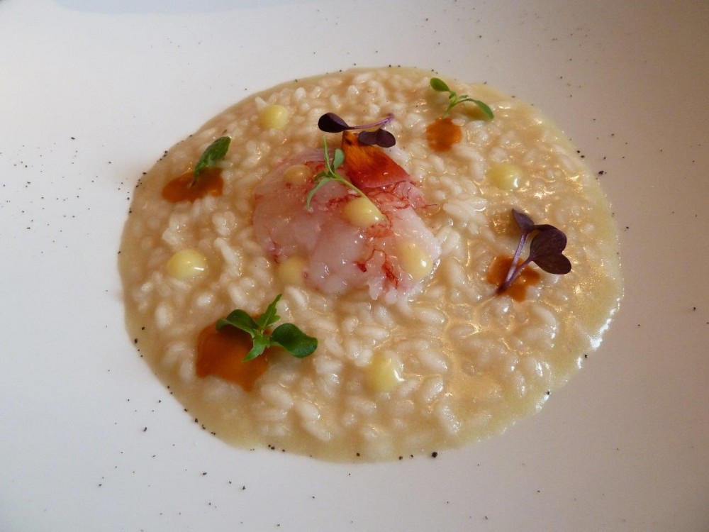 Rosso Di Sera, Castelletto Ticino. Risotto cotto nell’acqua e non nel brodo con gamberi rossi, la cottura “nature” ha sicuramente esaltato il contrasto tra la dolcezza del gambero e l’acidità che Cristiano ha voluto dare a questo piatto, acidità che mi ha ricordato l’asprezza gentile di una mela verde anche se in realtà si tratta di una soluzione cinquanta e cinquanta tra succo di limone non trattato e aceto bianco alla quale non è stato fatto mancare un tocco di zenzero, la soluzione viene preparata al tramonto quando il cielo si tinge di rosso, di sera quando la quiete invita alla riflessione vengono le idee migliori, la soluzione viene destinata ad usi domestici e il lime riprende di diritto il suo posto nel risotto che in realtà non aveva perso mai.