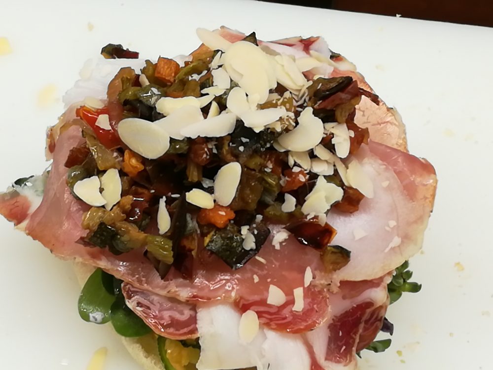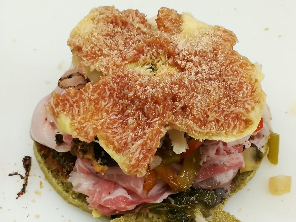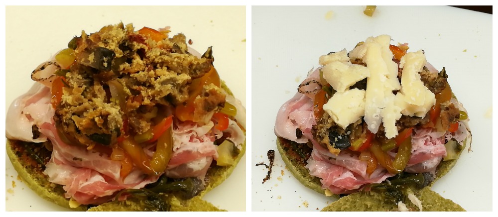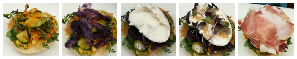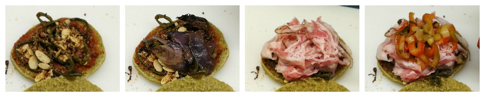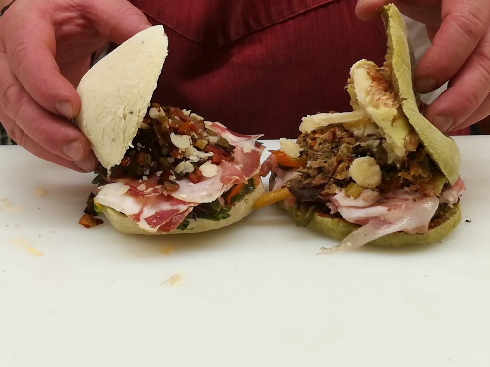 Il primo panino ha un impasto con finocchio e prezzemolo; salsa di capperi, sedano, timo limonato e peperoncino; insalata di zucchine, sedano, carota di Polignano e portulaca; chips di patate viola; burratina al Tartufo; buccia di limone disidratata dall’intenso profumo come un limoncello; micro ortaggio (germogli) di Ravanello; filetto lardellato di maiale; caponata alla Pugliese; mandorle sfogliate; vaporizzazione di mela fermentata, fiori di sambuco e menta.
