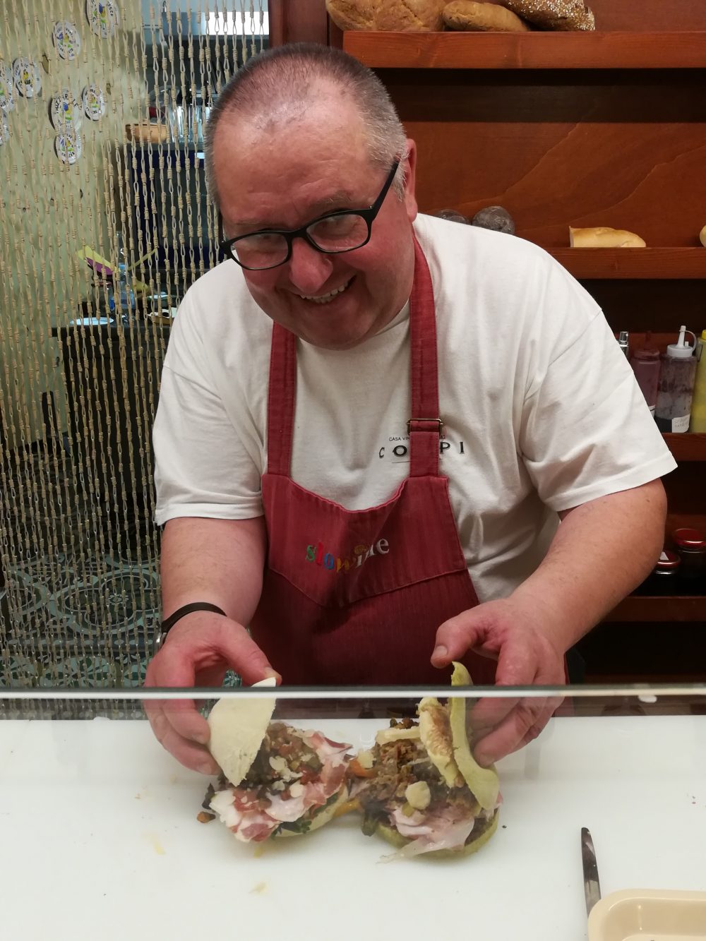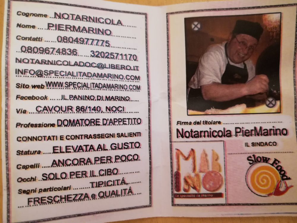 Esuberante e preparatissimo, Marino è un vero e proprio mito dell’enogastronomia della Valle d’itria e della Puglia intera. I suoi panini sono dei viaggi alla scoperta degli sconfinati sapori di questa meravigliosa terra. Tanti ingredienti per ogni preparazione sapientemente combinati tenendo in parte conto dei gusti dei clienti.