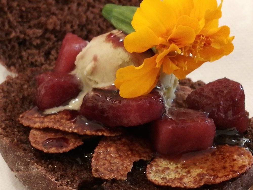 Il dolce è fatto con panino con impasto al cioccolato; gelatina al limone e menta piperita; fiocchi di mais al cioccolato; pera caramellata al Primitivo con anice stellato e cardamomo; gelato artigianale al Pistacchio; scirocco artigianale di amarene; fiore di Dalia vaporizzato con infuso di menta piperita e mandorle amare.