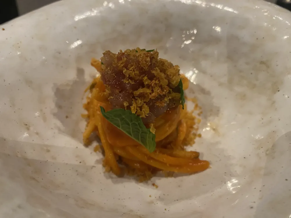 Ancora un altro piccolo, sapido piatto: spaghetto freddo all’arrabbiata con tartare di tonno oceanico e bottarga. Quel tocco mediterraneo che ci piace, perché c’è appena un tocco di buccia di limone non invadente, come in altri indirizzi anche nostrani.