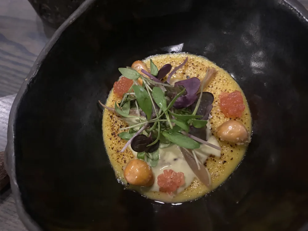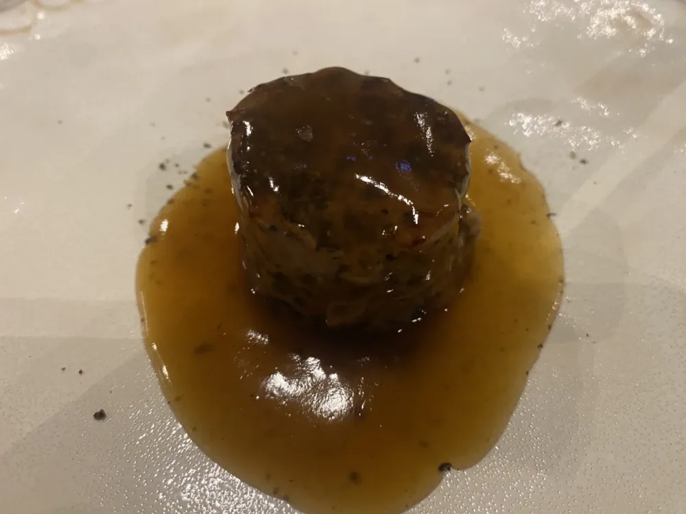 Un merluzzo con una salsa concentrata di “toffee marino”, kefir-lime e sformato di patata di Tenerife e patata dolce.