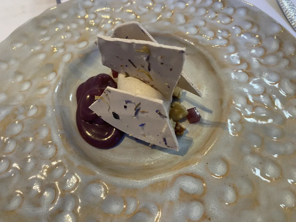 Pane con lievito madre, grissini, una memorabile focaccia all’olio con polevere di pomodoro essicato. Olio locale per intingere, sale con erbe di Tenerife, ancora patè di fegati di pollo e burro al tartufo.