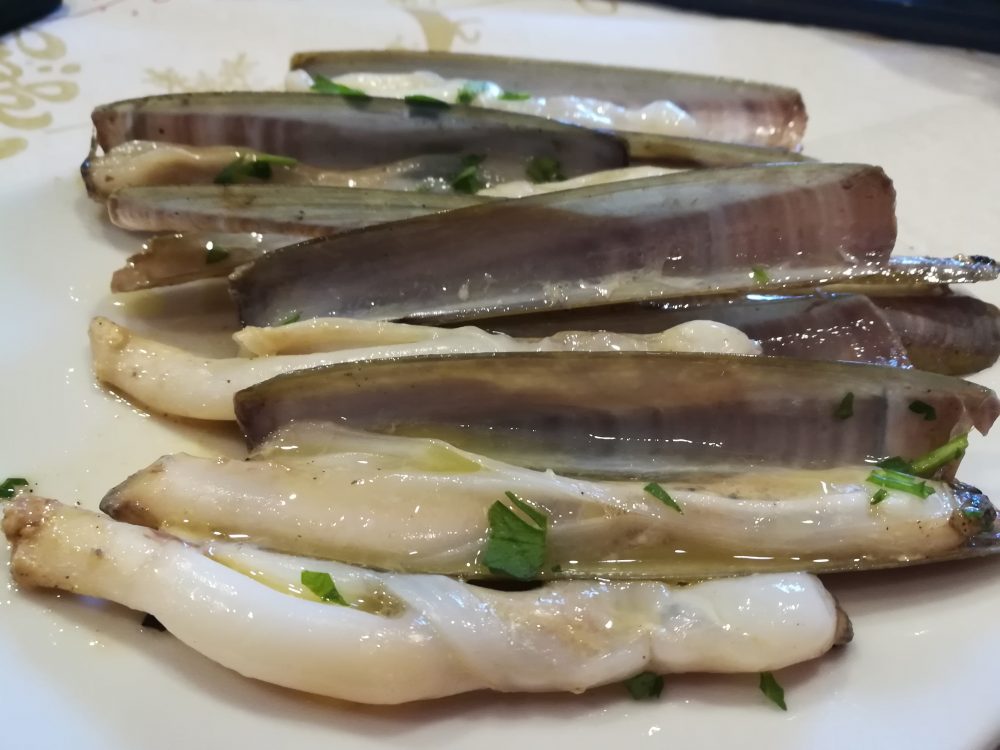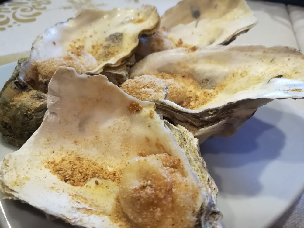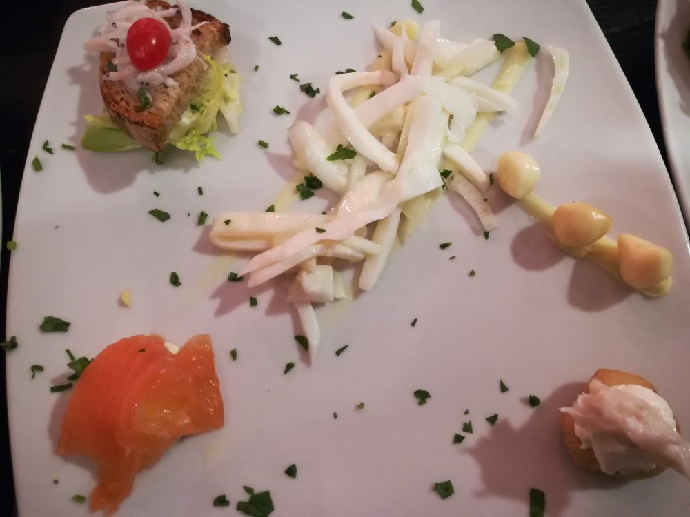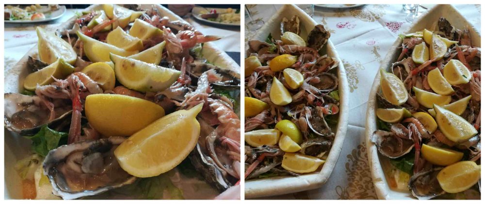 L’antipasto della casa è composto da svariate portate. Si inizia con un piatto nel quale ci sono una mousse di ricotta e pistacchi ricoperta da una fettina di salmone, un tarallino napoletano con ricotta e baccalà marinato, una buschetta con i bianchetti, delle provolette e un’insalata di tagliatelle di calamaro e finocchi. Dopo poco arriva il crudo di mare con ostriche, fasolari, tartufi di mare e scampi. Si prosegue poi con tante sfiziose specialità: Polpettine di stoccafisso con fonduta di formaggio; una sorta di Polpo&Chips (spiedino con patate e polipo fritti); Mousse di mare servita nei gusci delle ostriche; Bocconcini di baccalà fritto; Frittelle di cavolfiori e bianchetti; Cannolicchi arrosto; Parmigiana di Pesce Bandiera.