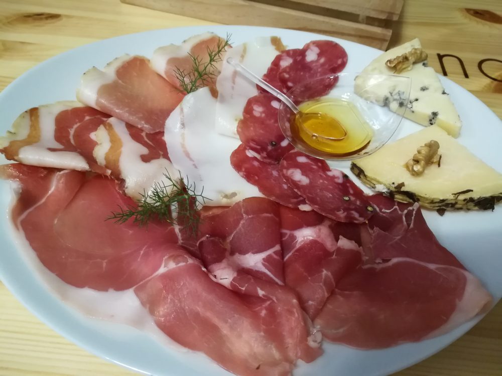 Sul tagliere troviamo l’immancabile Prosciutto Crudo Irpino; la Sopressata; il Lardo; la Pancetta; la Lonza; il miele di Sant’Agata de’ Goti; il Blu di Pecora dell’Azienda Agricola Carmasciando di Guardia dei Lombardi; il Pecorino di Montella stagionato ai Fiori di Montagna.