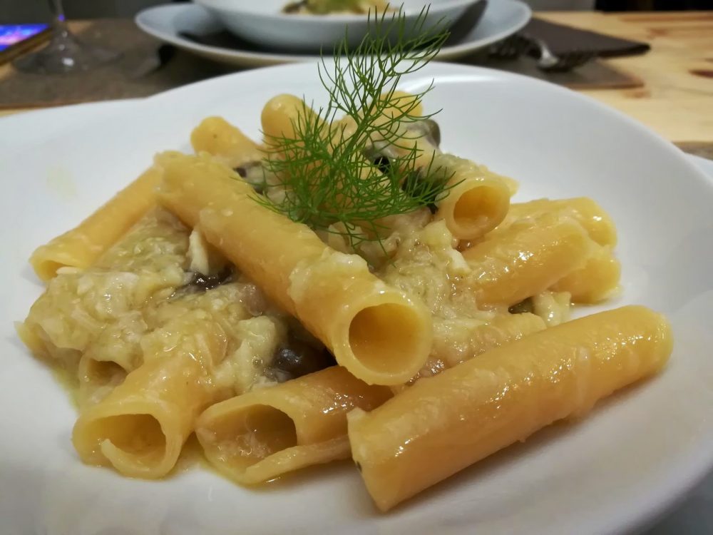 Tra i prodotti legati alla tradizione locale c’è il Baccalà e qui non mancano tante preparazioni nelle quali esso regna sovrano. Non possiamo dunque esimerci dal provarne una e la scelta ricade sulla Genovese di Baccalà con le Candele spezzate del molino e pastificio Armando di Flumeri nella Valle dell’Ufita. Impeccabile la cottura della pasta e adorabile il condimento.