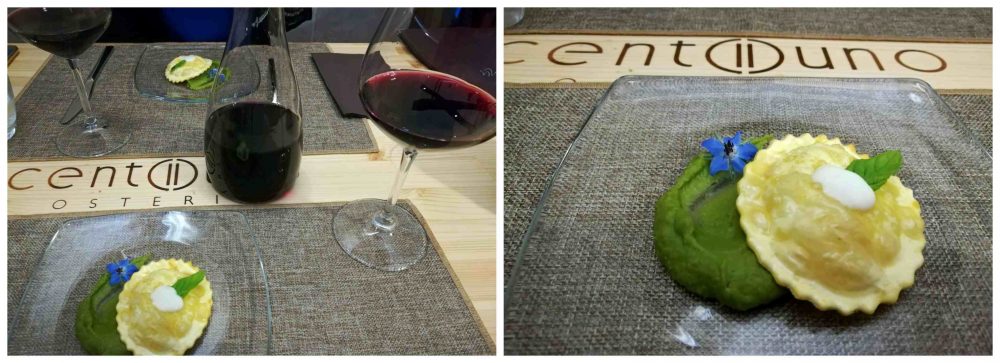 L’entrèe è composto dallo gnocco fritto, proveniente dal pastificio artigianale “La Rustichella” di Montemiletto, ripieno di ricotta e adagiato su una stagionale vellutata di piselli freschi.