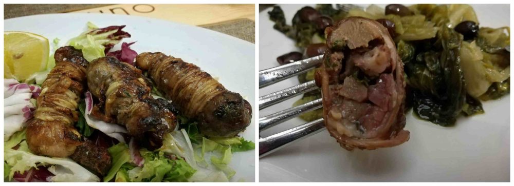 Per la scelta del secondo non abbiamo avuto bisogno del menù poichè già avevamo ben in mente dalla volta scorsa che dovevamo prendere i Mugliatielli arrostiti, degli involtini di interiora e frattaglie di agnello (o capretto) avvolti con il proprio intestino. Un piatto povero della tradizione contadina che è una vera e propria prelibatezza ma non sempre facile da trovare. Per contorno abbiamo optato per le Scarole saltate con capperi e olive.