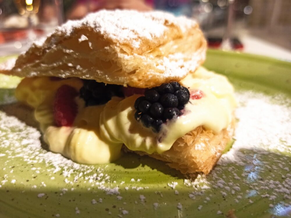 Sentiamo dire che lo Chef nasce come pasticciere e pertanto non possiamo fare a meno di provare uno dei sui dolci, in particolare la Millefoglie (4 euro) con una crema buonissima che chiude in bellezza la cena.