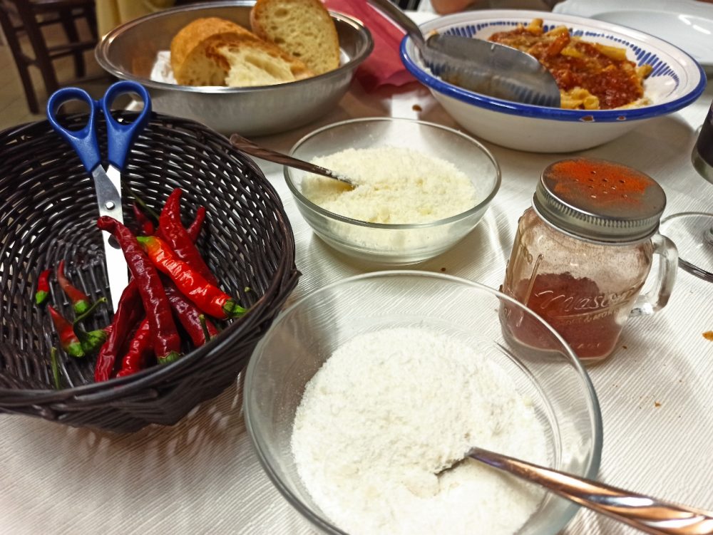 Tra i primi piatti è d’obbligo assaggiare le Cannazze (il cui nome deriva dalla pasta lunga e tubolare che nel 700 veniva fatta essiccare sulle “canne”), fatte con gli ziti spezzati e condite con un superlativo ragù di carne cosparso di pecorino (6 euro). A tavola però, per chi vuole osare, non mancano delle ciotole con altro pecorino e con del Cacioricotta grattugiato, il peperoncino in polvere e l’intrigante peperoncino fresco da tagliare a rondelline.