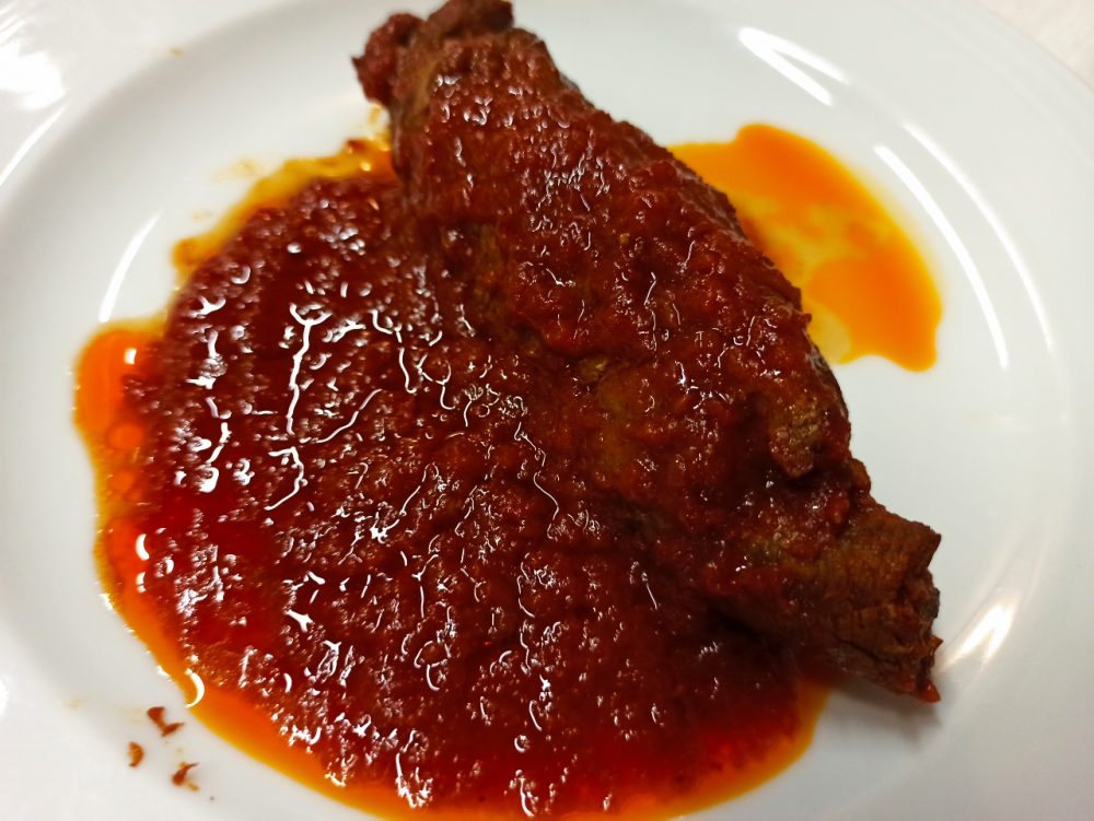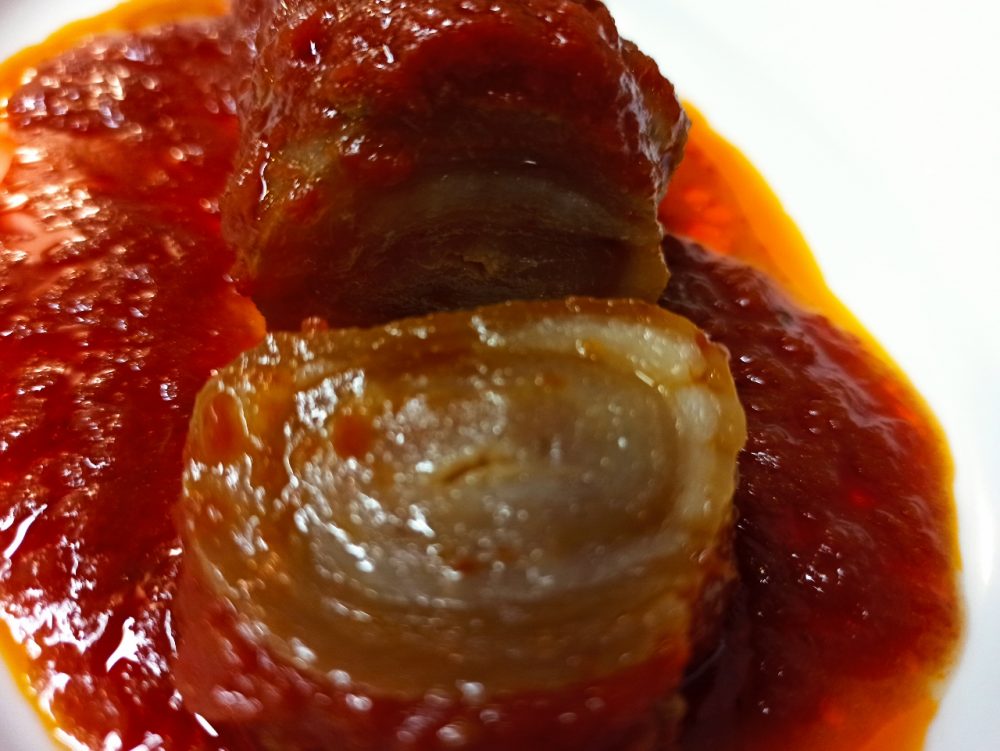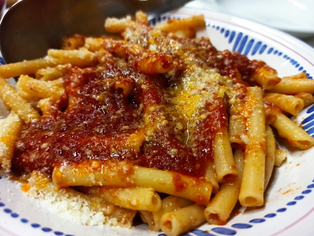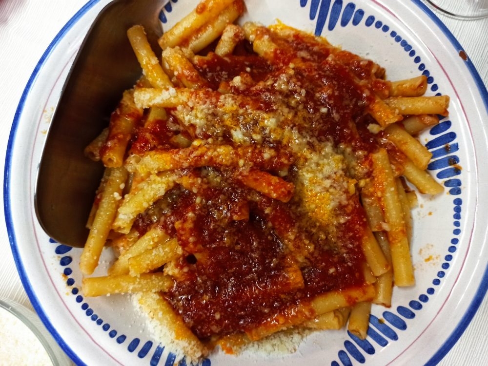 Quel ragù che viene fatto fresco ogni giorno, quel ragù che ci rapisce col suo profumo già alcune ore prime, quando ci fermiamo per prenotare per la cena mentre la cuoca è intenta a controllare la cotture della Vrasciola (6 euro), l’involtino di Vitello locale che andremo ad ordinare per secondo insieme ad un fuori menu gustosissimo rappresentato dalla Vrasciola e’Cotena (6 euro), un involtino di cotenna di maiale sempre al sugo.