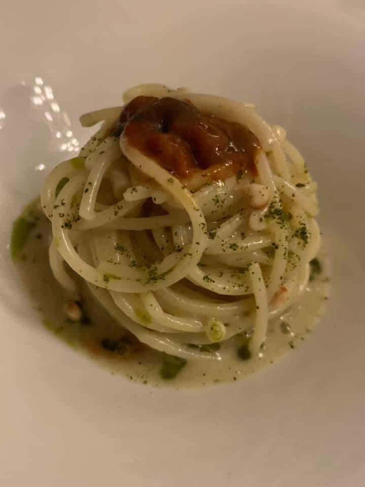 Con il risotto e gli agnolotti si concede due calci di rigore a porta vuota mentre con gli spaghetti sperimenta fino in fondo, coraggiosamente, i toni amari dei ricci. Da manuale i secondi di carne, placido l’atterraggio nel finale con un grande pre dessert di granita di carota al sale e un dolce non stucchevole.