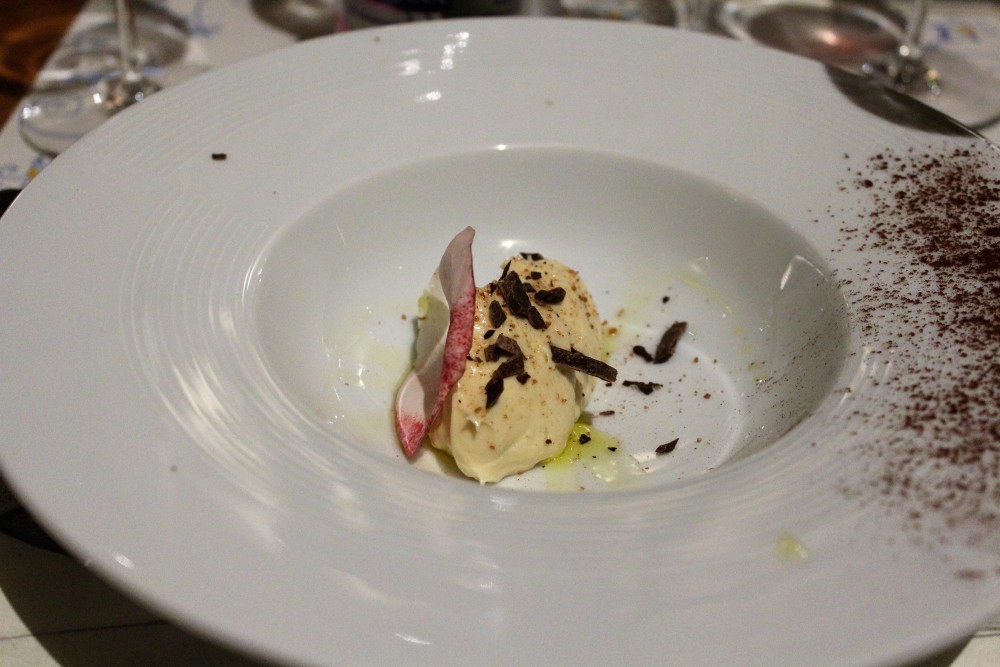 -dolce: cremoso alla mandorla amara profumato alla rosa con rocce di fondente extra al tabacco, lacrime di extra vergine declinato al limone, sale rosso