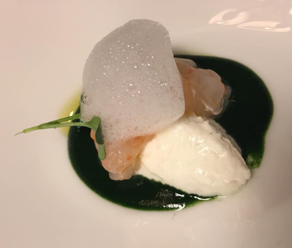 Ristorante Tosca Parigi, scampi marinati, stracciatella di bufala e shiso