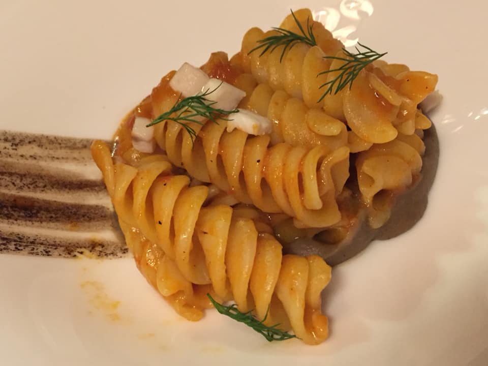 Tra i primi piatti del menu del Tosca, le eliche del Pastificio dei Campi con il coccio (gallinella di mare), una crema di melanzane affumicate e aglio nero fermentato.