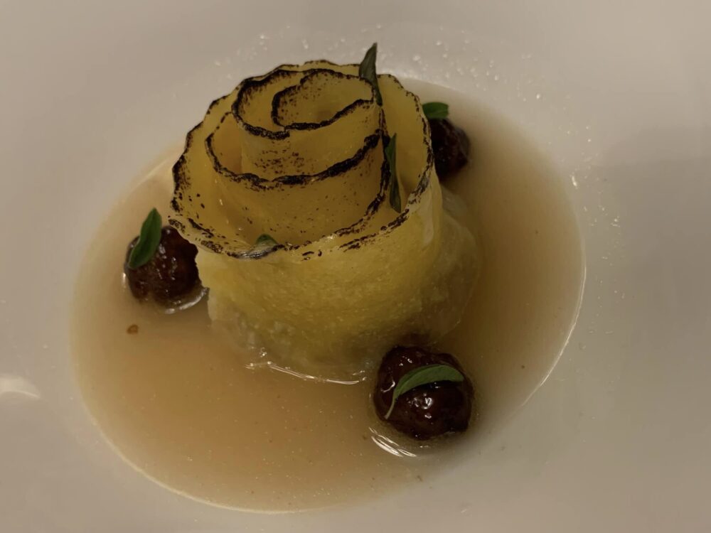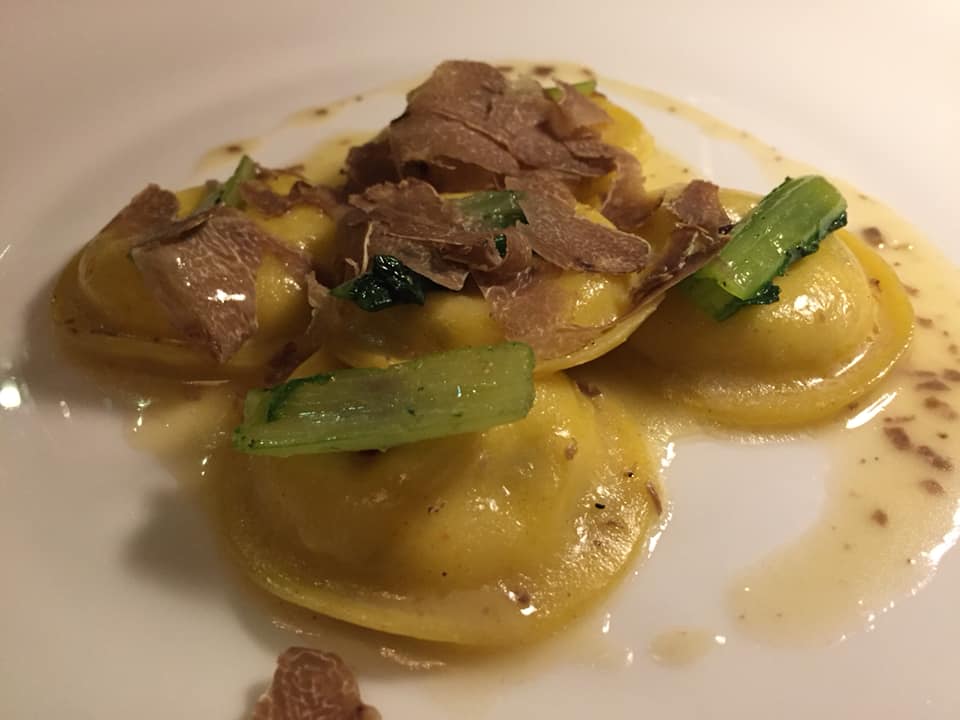 L’altro primo piatto, di Michelino Gioia, ci riporta invece al nord, con dei bottoni di pasta fresca ripeni di fontina, con cicoria e tartufo bianco.
