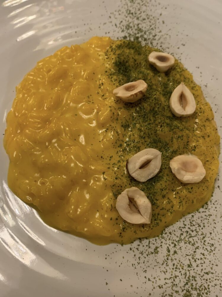 Ristorante la Tosca a Parigi, risotto allo zafferano con polvere di cavolo nero e nocciola di Giffoni