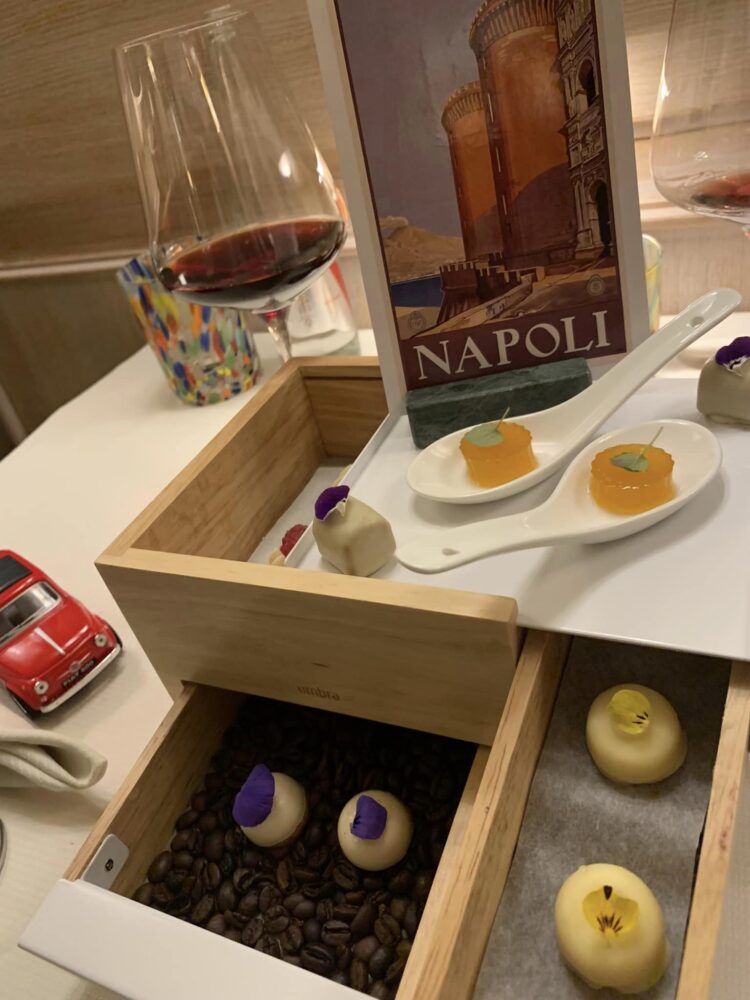 Tre anni fa eravamo stati qui per un evento, stavolta abbiamo potuto approfondire la cucina di Raffaele De Mase prendendo il menu degustazione (sei portate più aperitivo a 95 euro vini esclusi). Il ristorante non supera i trenta posti ma c’è una sala al piano superiore fronte cucina a vista con altri tavoli. L’ambiente è accogliente e trasuda italianità senza mezzi termini, dai modellini dlele 500 sui tavoli al corno napoletano, alla musica italiana d’antan sino alla carta dei vini italiana (champagne a parte), non molto ampia, ma equilibrata e con ricarichi ragionevoli.