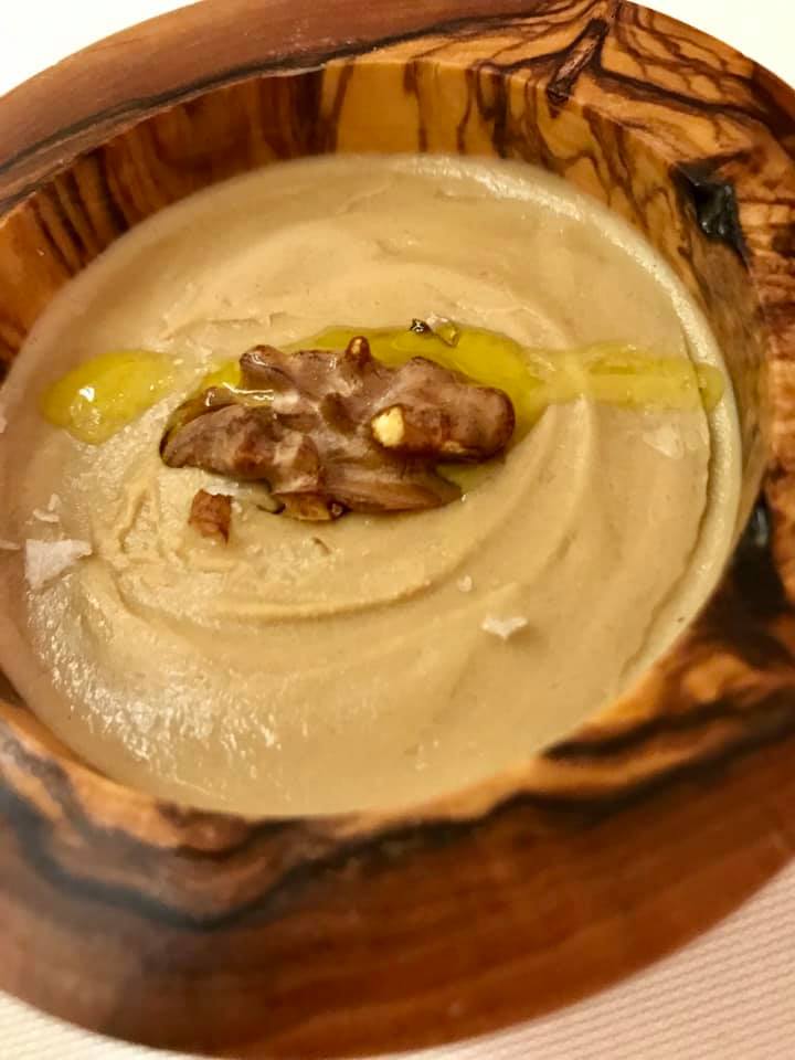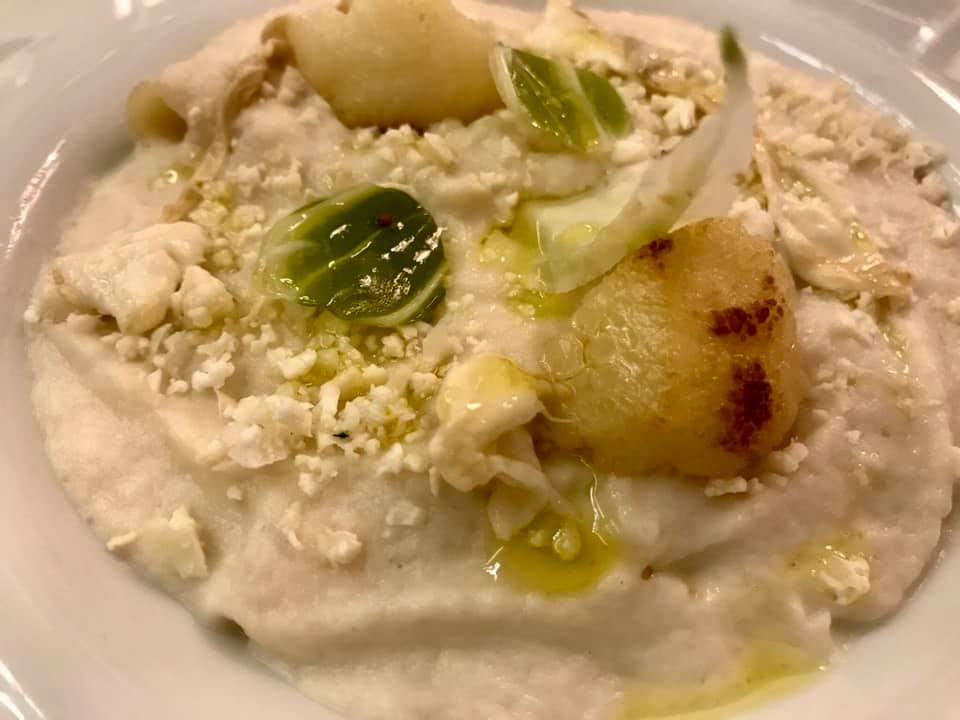 Piazzetta Milu’. Baccala’ mantecato, coriandolo, miele piccante e scarola cruda